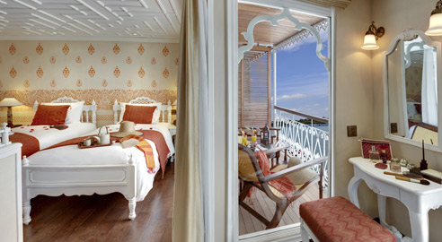 Two individually designed suites, ideally situated on the upper deck. - The Taj: This Indian Suite is peppered with Indian designs. A feast for the eyes, it features dark wood with camel bone inlayed chairs, tables, cabinets, side tables and a vanity case. The dining lounge, an extravagant solid camel bone sofa and the large majestic wooden bed evokes a full Shah feeling. This suite has two private balconies (11 m² in total), one of which has a Jacuzzi.- Lord Byron: as its name suggests, this is a British designed suite. The cabin features mint green walls, which are covered with original British colonial paintings, hazelnut coloured furniture and an exquisite shower. There is also a large balcony (11 m²) with an outdoor Jacuzzi