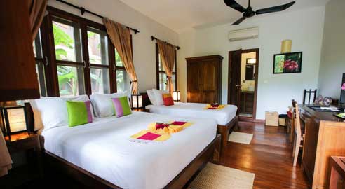 Located upstairs of the 3 pavilions, the Lotus rooms feature also a large bathroom, a spacious balcony to enjoy view over the peaceful garden, pool and ponds. Each room is decorated with wooden furniture and local materials. TV can be added upon request.Lotus Suites (4 units)