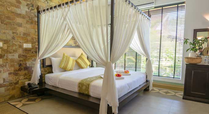 This traditional 75sqm Khmer villa feature two single 4poster beds, living area, and spacious bathroom with an outdoor bathtub, rain shower and a traditional Khmer shower surrounded by a private garden.Junior Suite Villa