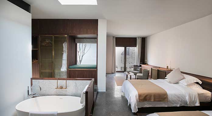 The rooms are 42-52 square meters in size and include a King bed only. Four of them are on the second floor with a private hallway and a window that looks out into the entire garden, while the other four are situated next to the lake in a private courtyard and face the Slender West Lake water system. The primary decorative materials are brass and native teak wood. Elegant and succinct, the white walls and blue bricks accentuate Yangzhou's distinctive architectural traits.Private Courtyard Suite (1 unit)