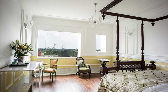 Victoria Suite: This suite has a king size bed and direct views of Victoria Memorial and the Calcutta maidan. There is an extra room at the entrance, oversized bathtub and shower area, but no balcony or veranda.Maidan Suite: This suite has a king size bed, direct views of Victoria Memorial and a private balcony overlooking the Calcutta maidan.