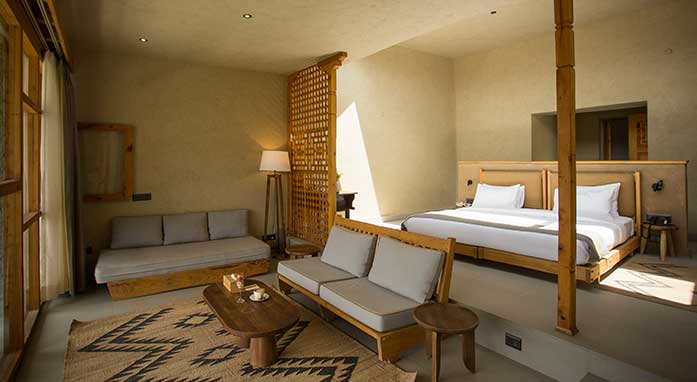 At 65sqm the Deluxe Rooms at the Kyagar Hotel comfortably sleep 2 people on the large, 7ft by 7ft Hollywood Twin bed set in each room, or a maximum of 3 guests with the addition of an extra bed (chargeable). Perfect for solo travellers, couples, small families or friends travelling together. The front of each Deluxe Room is floor to ceiling wood-framed windows that share uninterrupted breathtaking views of the surrounding Nubra Valley mountain scenery. But the highlight of these rooms has to be the skylight. Set directly above the bed, the skylight is perfectly placed to share stunning views of the night sky, and is fitted with an electronically opening and closing blind for when you are ready to stop star gazing and start sleeping. Interiors are in a natural earth-tones palette and furniture is all hand-made from locally sourced wood by local craftsmen. The large private en-suite bathrooms are set with double wash basins and a walk-in shower. The Deluxe Rooms at The Kyagar Nubra also enjoy a terrace, the perfect place to enjoy your morning tea or coffee while looking in wonder at in the awesome scenery on your doorstep.Useful Information