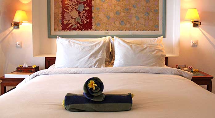 The Standard Rooms have views over the property’s well-tended gardens, whereas the Superior Rooms look out over the water. All rooms come with a queen-sized bed and an extra bed can be added to increase the capacity of those who choose the Superior option, and the helpful Lotus Bungalows Candidasa staff are always happy to help with any special requirements for those visiting with young children. Other room features include a spacious wardrobe, safety deposit box, electric kettle, and well-stocked minibar. As well as light and airy accommodation, visitors to Lotus Bungalows Candidasa beach can enjoy stunning sea views over the Lombok Strait from the beach beds surrounding the hotel’s impressive infinity pool.