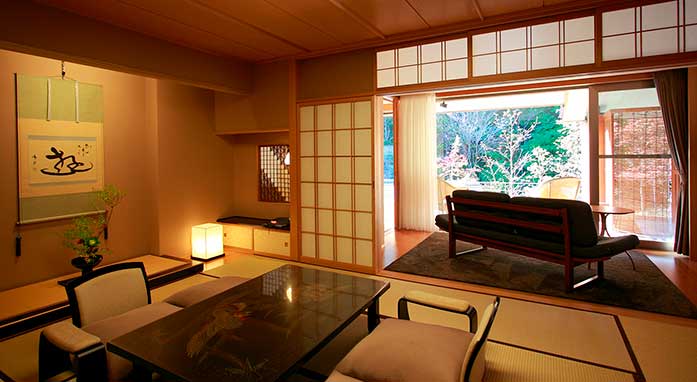This 92 square meter, four-room Japanese-style suite is Takinoya's top room and is completely covered in tatami. The rotemburo is a sizable tub constructed from local slate that is situated on a sizable wooden platform and looks out over a forested glade. The deck is complemented by spacious living and sitting areas, and meals are served in-room in the dining room next to tall windows that face out over a hillside covered in trees.Japanese Western Suite DY