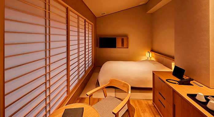 On the second story, these rooms are 24 square meters, sparsely divided, Japanese-inspired decorations with a covered seating area near the window. The Deluxe Double Room can accommodate a maximum of two guests, while the Deluxe Twin Room can accommodate a maximum of three guests. Each non-smoking room has a street view, a shower in the bathroom.Deluxe Twin Room with Open-Air Bath