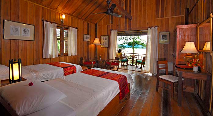 At approximately 37sqm the Mekong View Bungalows are set with either Twin Single beds or a King bed and can comfortably sleep up to 3 guests with the addition of an extra bed (chargeable). The bungalows are built in a traditional Laos style, using local materials and design touches to create a wonderful sense of place for guests. Each bungalow is fitted with air-conditioning and has a private en-suite bathroom with walk-in shower and eco-friendly bathroom amenities made by local artisans. The terraces of the Mekong View Bungalows face the Mekong River sharing beautiful views of the river and sacred hills of Vat Phou beyond. Room amenities include in-room safe, complimentary WiFi, tea and coffee set, hair dryer, bathrobes and eco-friendly bathroom amenities.Ban Lao Suite