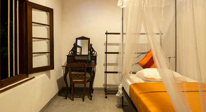 At approximately 9 sqm in size, the two single rooms at Gileemale Walawwa, are perfect for solo travellers. Named the Alexandrite Room and the Ruby Room, they are both set with a single bed fitted with mosquito nets, hardwood antique furniture including a dressing table, and a pedestal fan.Double Rooms (4 units)