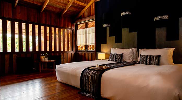 All 3 Villas are inspired by Lanna architecture and built in a contemporary Lanna style with teakwood and brickwork.- The Little Chiang Saen is a 3-bedroom unit suitable for a maximum of 6 adults and 3 children with 3 extra beds. Set over 235sqm on the ground floor, the villa offers 2 bedrooms with a large king bed and the 3rd one with twin beds, each with an ensuite bathroom. A sofa can be converted in extra bed in the living room. Balcony with view over a pagoda.