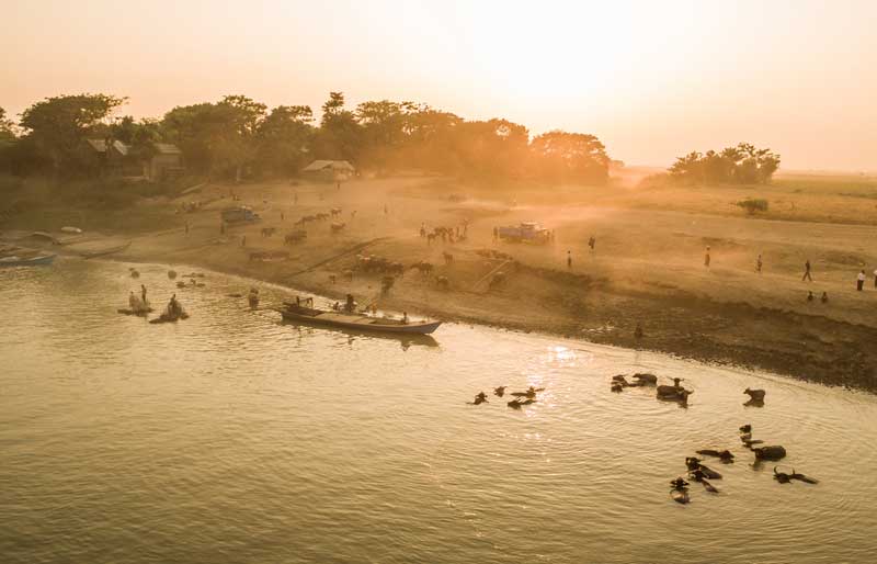 In the evening, enjoy the stunning view of sunset on the Irrawaddy River from the unique Resort's deck.