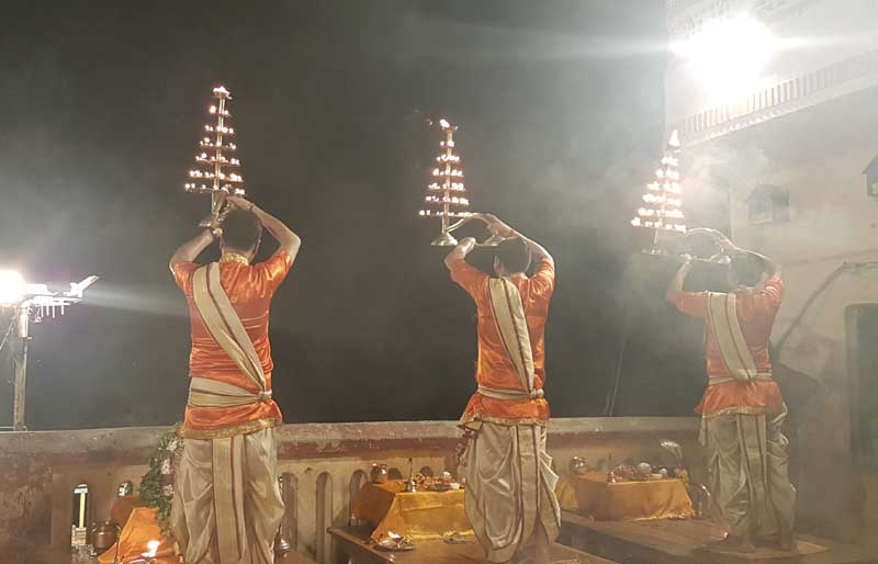 Later, if you are interested we can also arrange a city tour by cab, visit the Buddhist Sarnath, the location where Buddha was first taught the Dharma (near the confluence of the rivers Ganges and Varuna). In the evening, Indian classical dances are performed at Palace, or atted the evening ceremony and prayers “Aarti” at Dashashwamedh Ghat by a shared boat (no guide) along with a short ride up to Manikarnika and back. Anytime during the day, you can enjoy aomplimentary shuttleboat pick-ups and drops (time-table) to and from Mahishasura/Assi Ghat.