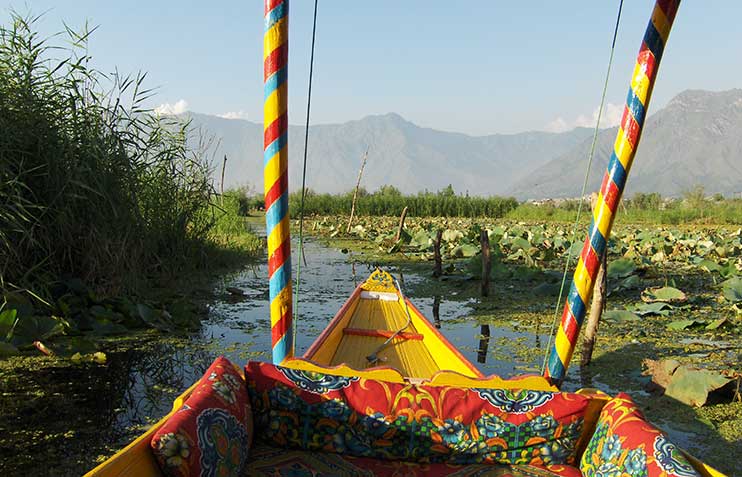 In the evening, enjoy a gentle shikara (Kashmiri canoe) ride through wetlands in the heart of the lake to see people farming on the manmade islands cultivating flowers and vegetables.