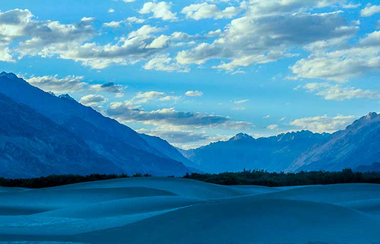 roads, Khardung La (5,600m). It is at the same altitude as the base camp of Mt. Everest. Enjoy the aerial view of the snow-clad mountains. Nubra Valley, once on the trading route that connected eastern Tibet with Turkistan via the famous Karakoram Pass, is the most recently opened area of Ladakh. Nubra invites you to a trip back in time into a nearly forgotten 'Shangri La'. With breathtaking views and delightfully hospitable inhabitants, it is quite an experience. We will reach the property by noon and have lunch.